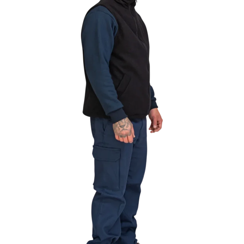 Este chaleco de trabajo polar cuenta con cuello alto con cierre frontal, proporcionando una mayor protección térmica y permitiendo regular la ventilación según la actividad. La cintura con ruedo o elástico de ajuste con tanca asegura un calce cómodo y adaptable al cuerpo, favoreciendo la libertad de movimiento durante la jornada laboral.